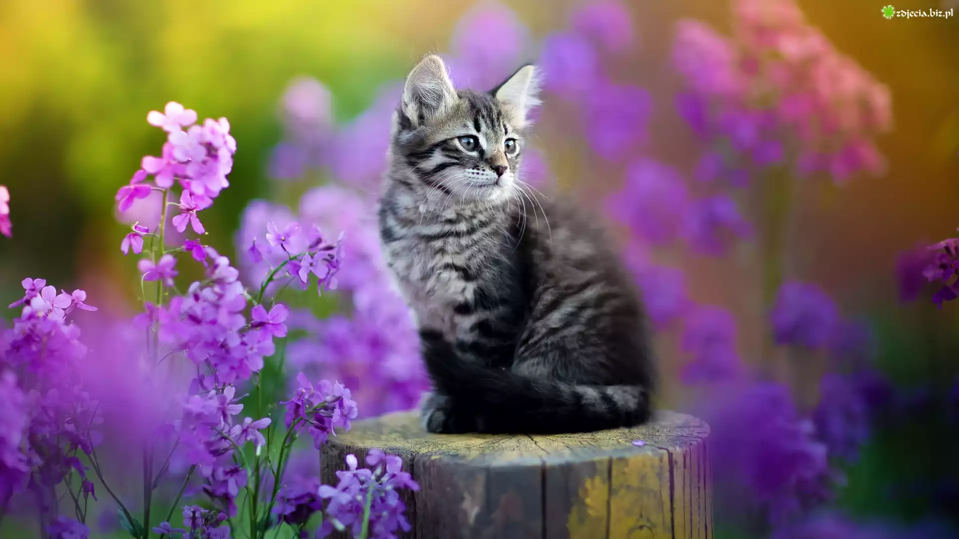 Zdjęcie Bury, Mały, Kot, Fioletowe, Kwiaty, Pieniek