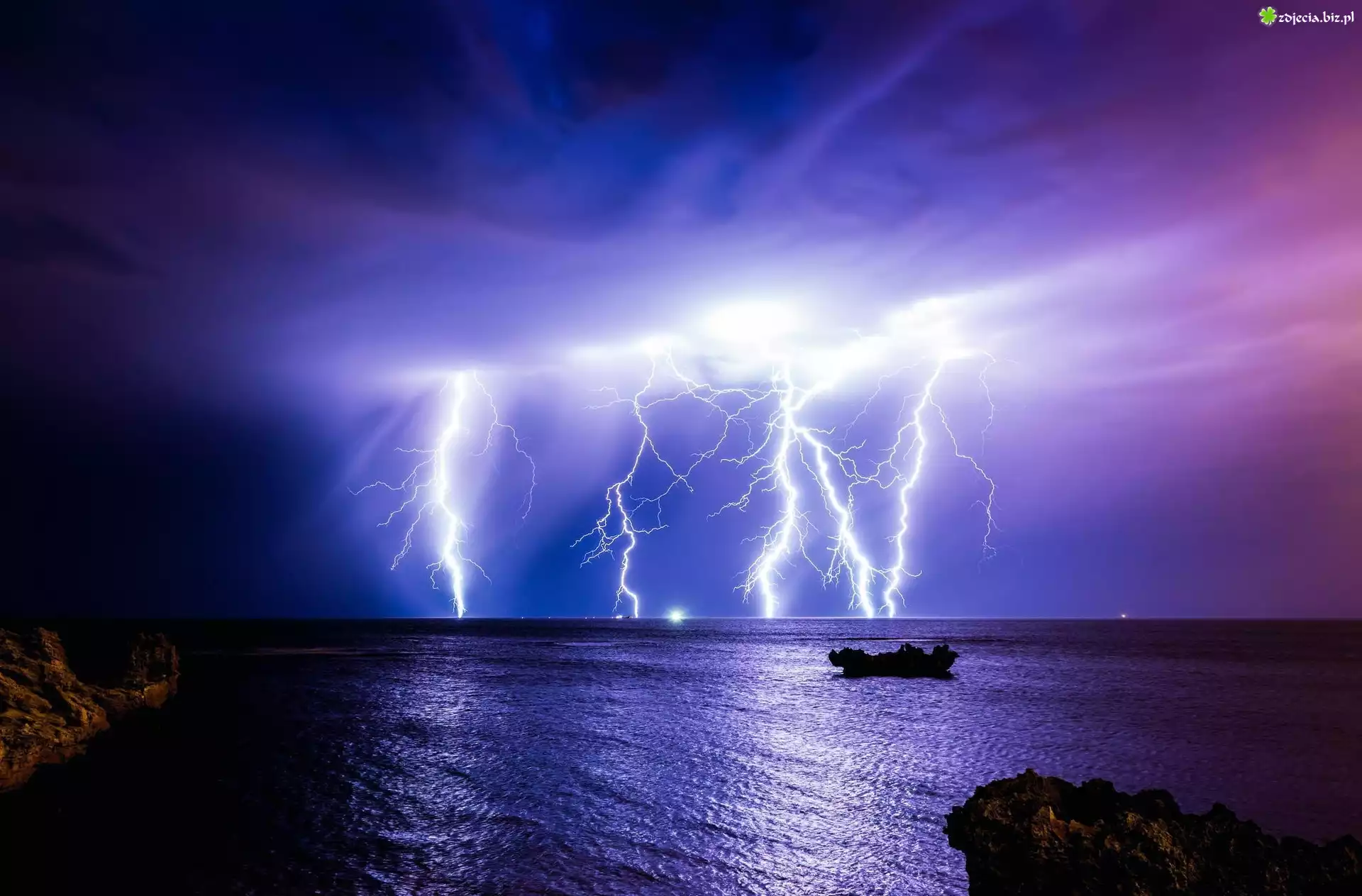 Zdjęcie, Burza, Pioruny, Błyskawica, Morze, Noc