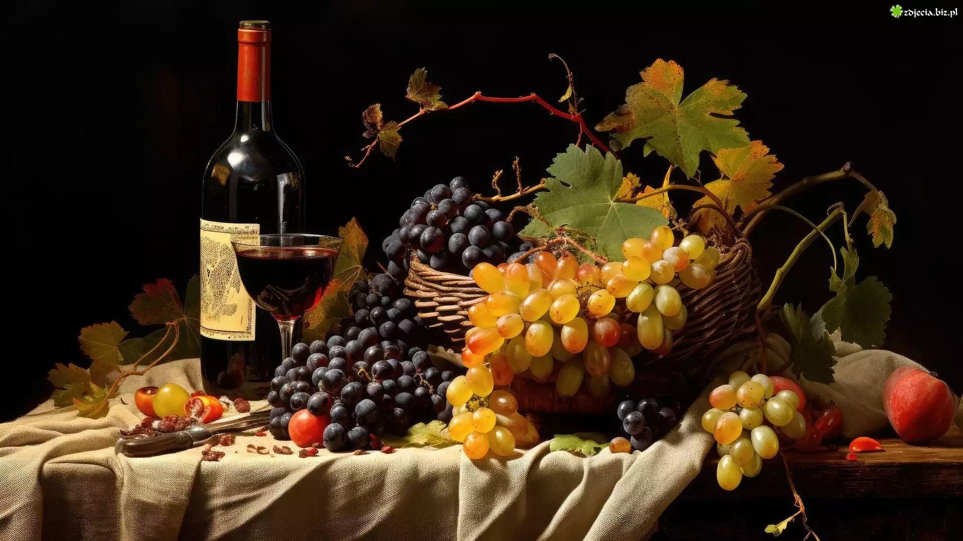 Zdjęcie Kompozycja, Winogrona, Kosz, Butelka, Wino, Liście, Materiał
