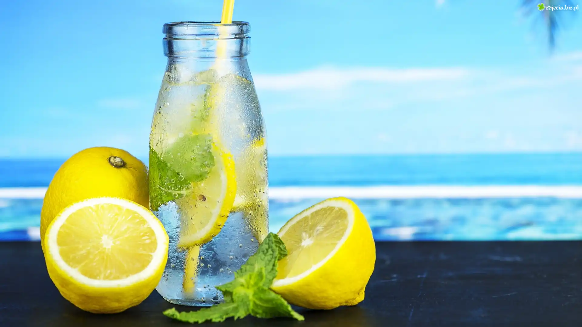 Zdjęcie, Butelka, Cytryny, Lemoniada, Słomka, Mięta