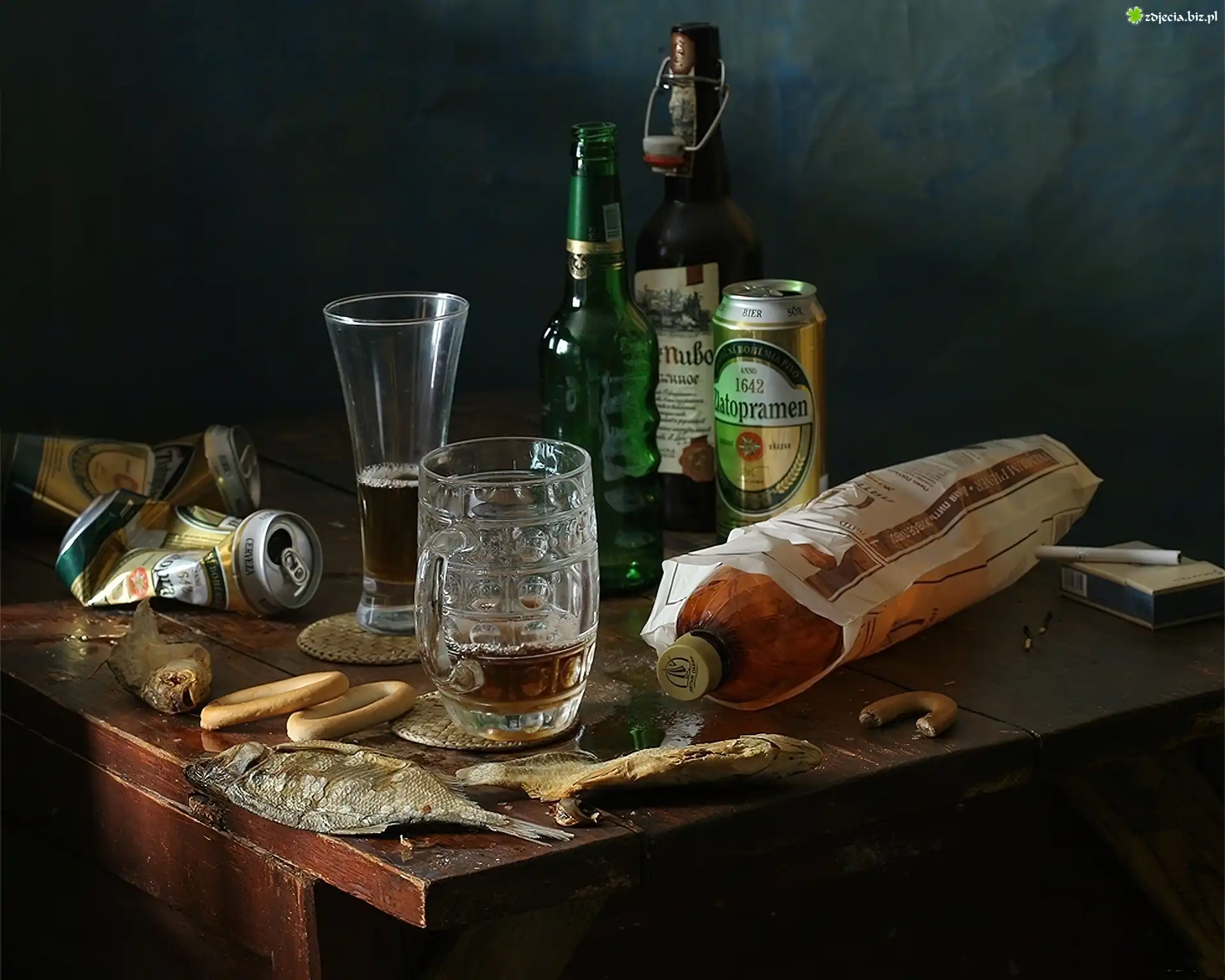 Zdjęcie, Butelki, Alkohol, Puszki, Piwo, Suszone, Ryby
