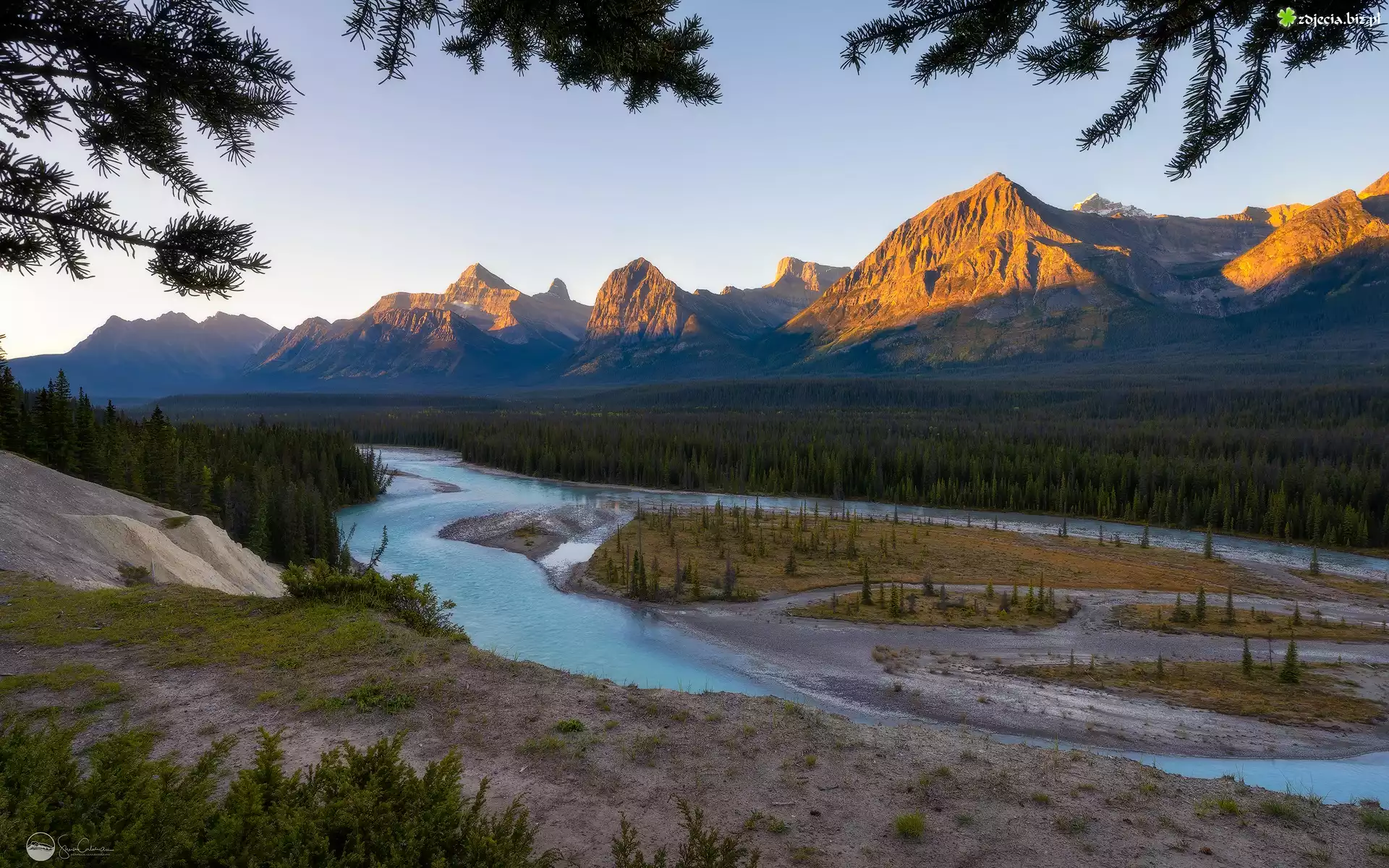 Zdjęcie, Kanada, Alberta, Park Narodowy Jasper, Góry, Canadian Rockies, Rzeka, Las, Drzewa