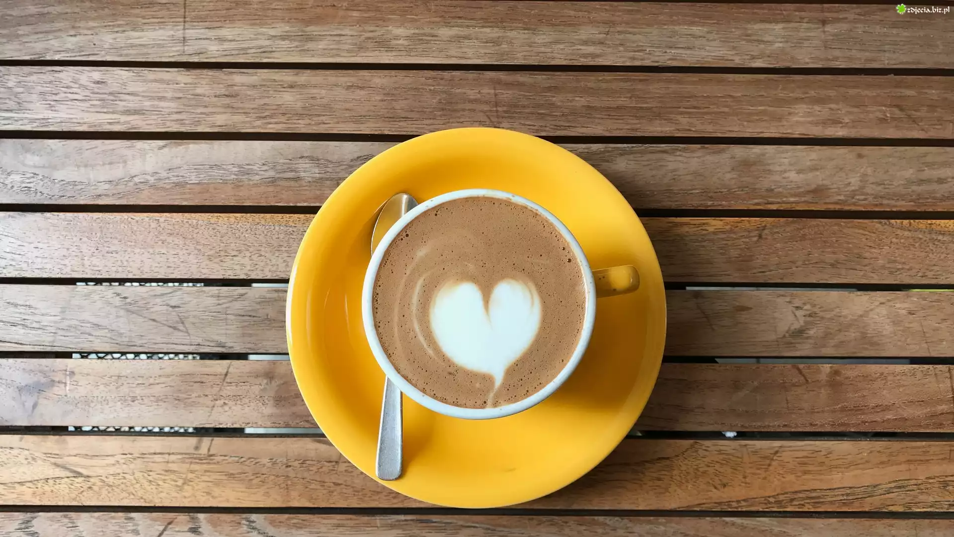 Zdjęcie Kawa, Cappuccino, Pianka, Serce, Łyżeczka, Żółta, Filiżanka, Deski