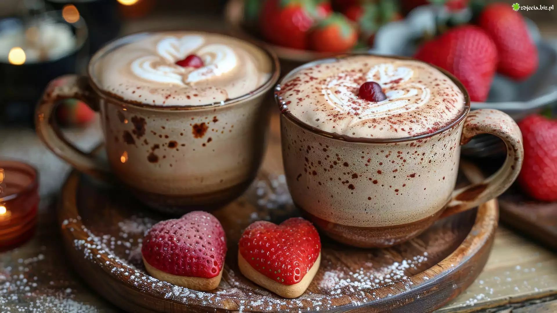 Zdjęcie Dwie, Filiżanki, Kawa, Cappuccino, Taca, Serduszka
