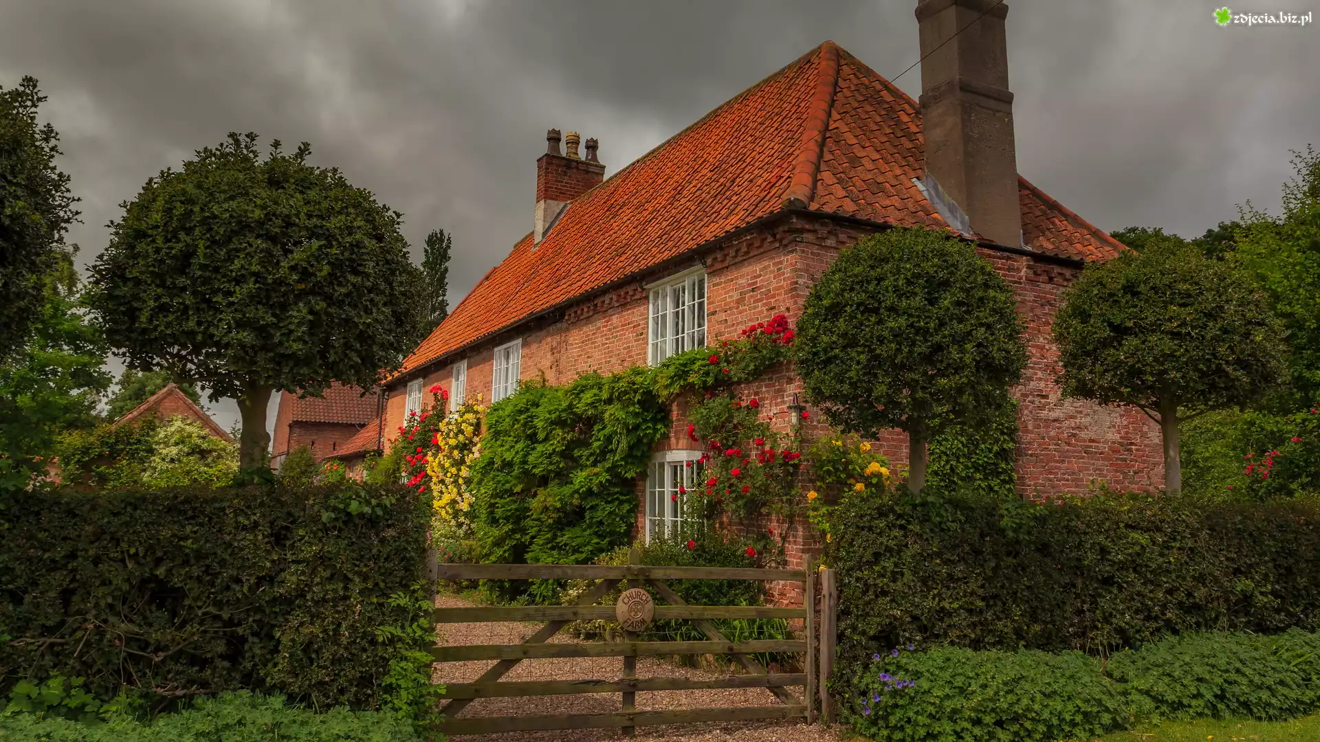 Zdjęcie Ceglany, Dom, Drzewa, Żywopłot, Brama