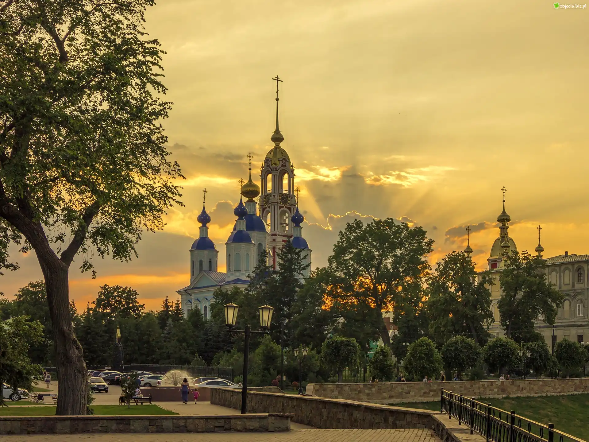 Zdjęcie Cerkiew, Zachód, Słońca, Drzewa, Alejki