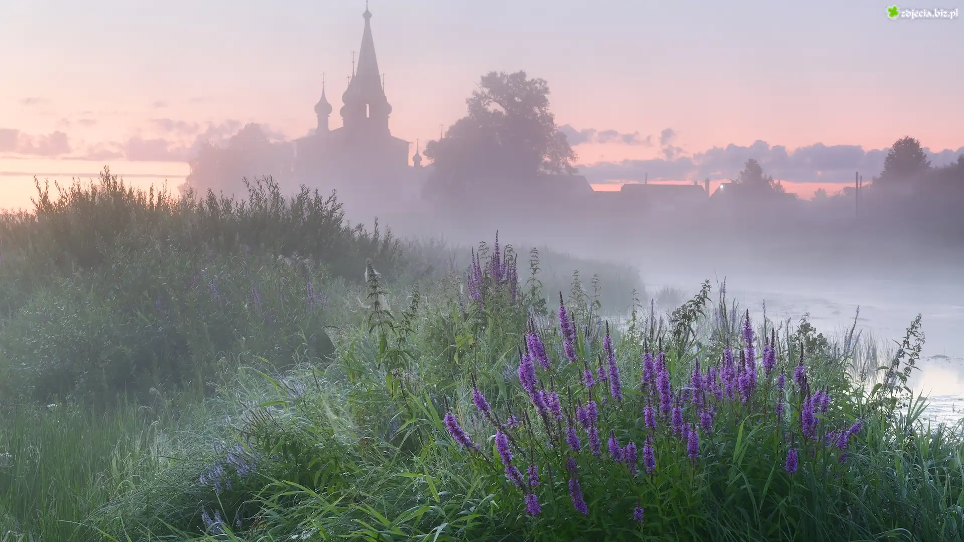 Zdjęcie Cerkiew, Mgła, Łąka, Rzeka, Kwiaty, Trawa