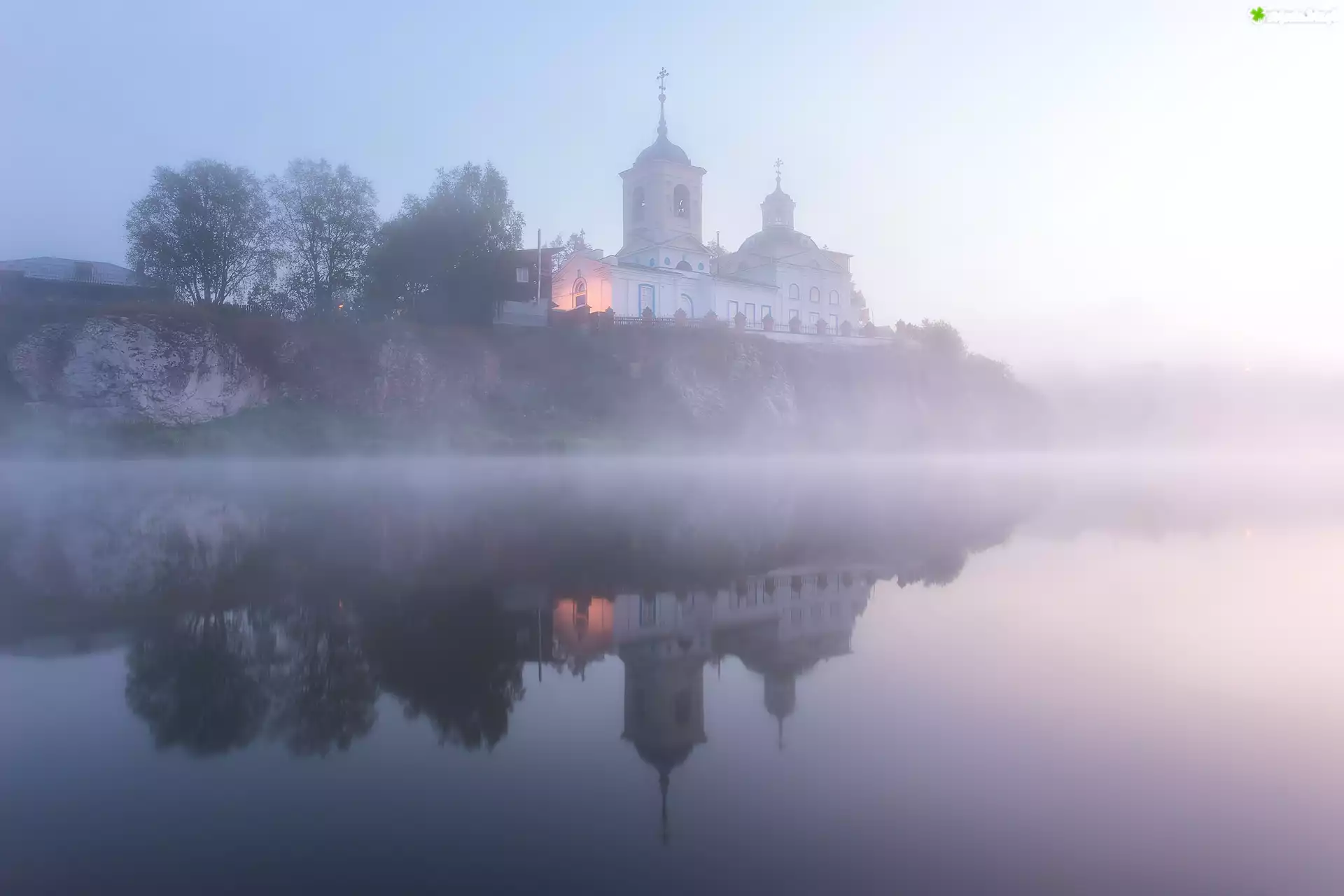 Zdjęcie, Cerkiew, Rzeka, Drzewa, Mgła, Odbicie