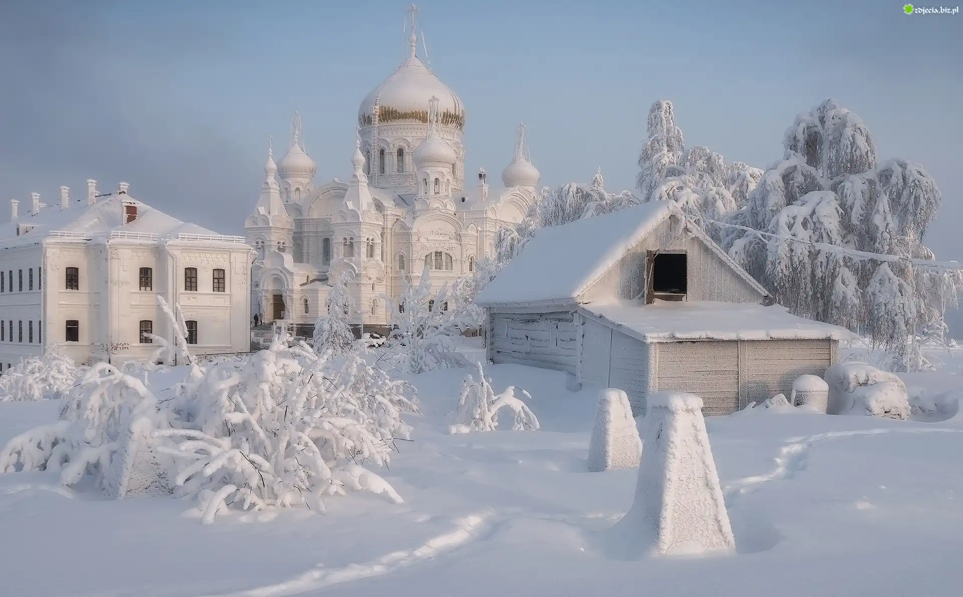 Zdjęcie Cerkiew, Białogórski Monaster św Mikołaja, Zima, Śnieg, Ośnieżone, Domy, Drzewa, Biała Góra, Obwód permski, Rosja |
