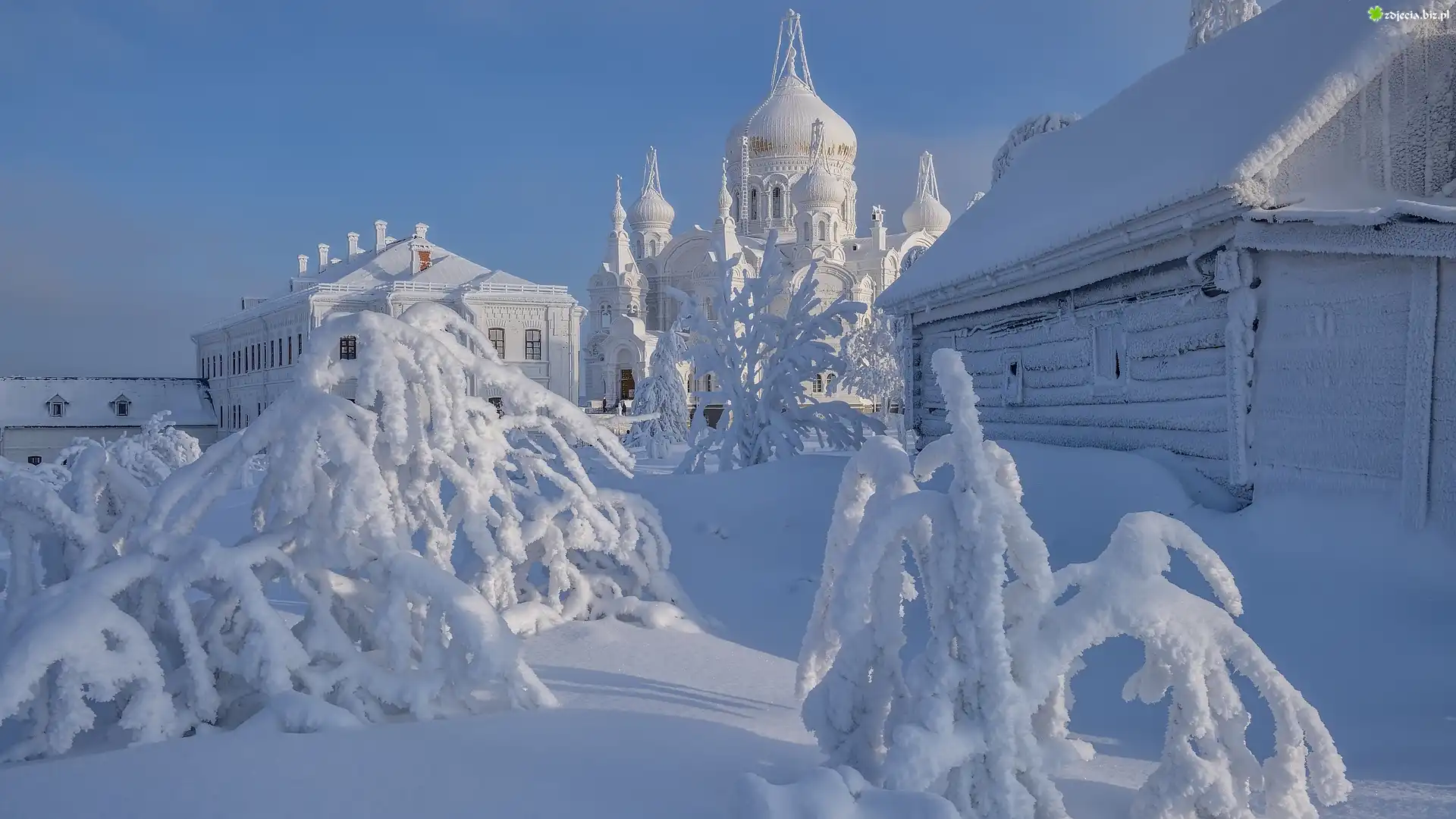 Zdjęcie Cerkiew, Białogórski Monaster św Mikołaja, Zima, Śnieg, Ośnieżony, Dom, Drzewa, Biała Góra, Obwód permski, Rosja |