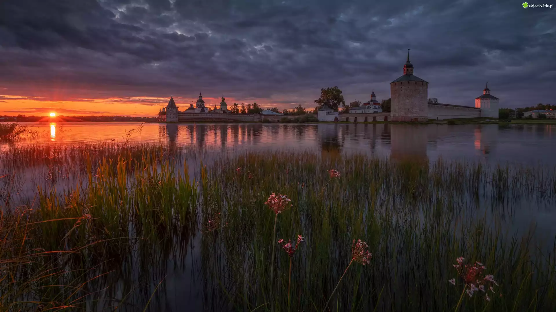 Zdjęcie Zachód słońca, Jezioro Białe, Szuwary, Chmury, Cerkiew, Klasztor, Monastyr Świętego Cyryla Biełozierskiego, Kiriłłow, Obwód wołogodzki, Rosja |