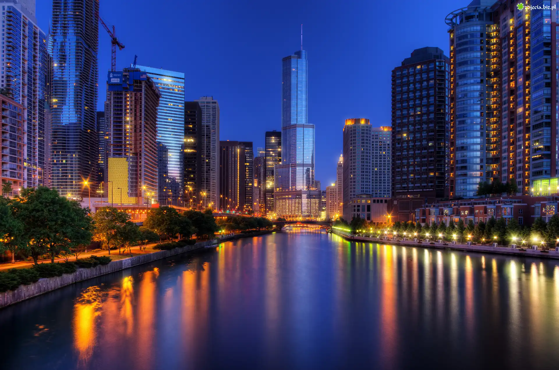 Zdjęcie, Chicago, Noc, Rzeka, Wieżowce