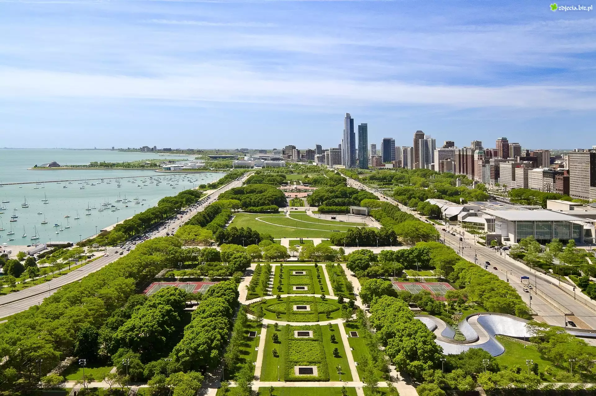 Chicago, Wieżowce, Jezioro Michigan, Niebo, Chmury, Zmrok, Stan Illinois, Stany Zjednoczone Chicago Chicago, Lincoln Park, USA, Wieżowce, Most, Noc Chicago, Illinois, Nocą Chicago, Architektura, Drapacze chmur, Morze Chicago, Panorama, Miasta, Zachód, Słońca Chicago, Stany Zjednoczone, Ulica, Zima, Śnieg, Ośnieżone, Drzewa, Płot Widok, Chicago Wnętrze, Hotelu, Sax, Chicago, USA