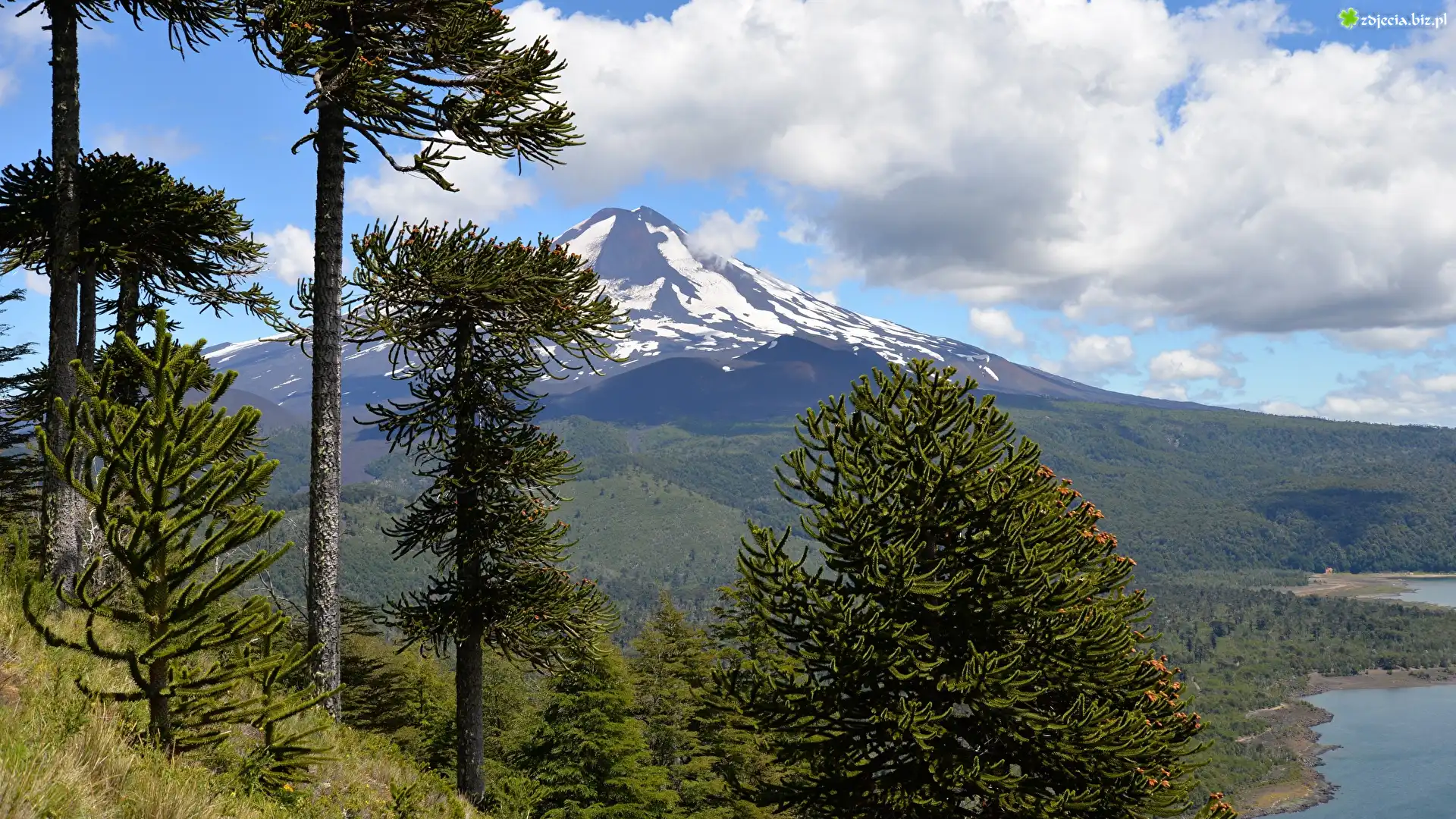 Zdjęcie Góra, Wulkan Llaima, Drzewa, Araukarie chilijskie, Park Narodowy Conguillio, Chile