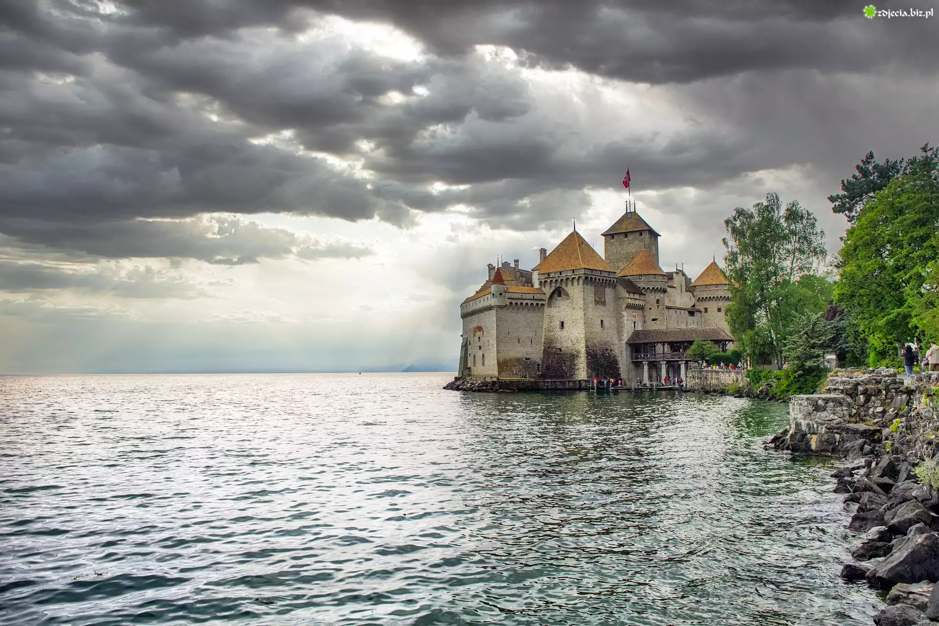 Zdjęcie Zamek, Chateau Chillon, Skała, Jezioro Genewskie, Ciemne, Chmury, Kanton Vaud, Szwajcaria
