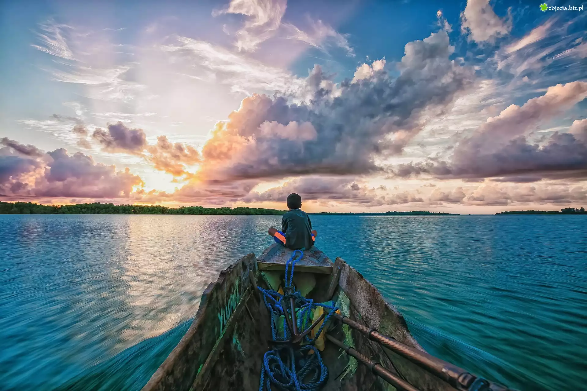 Zdjęcie Laguna, Morze, Łódka, Chłopiec, Niebo, Chmury