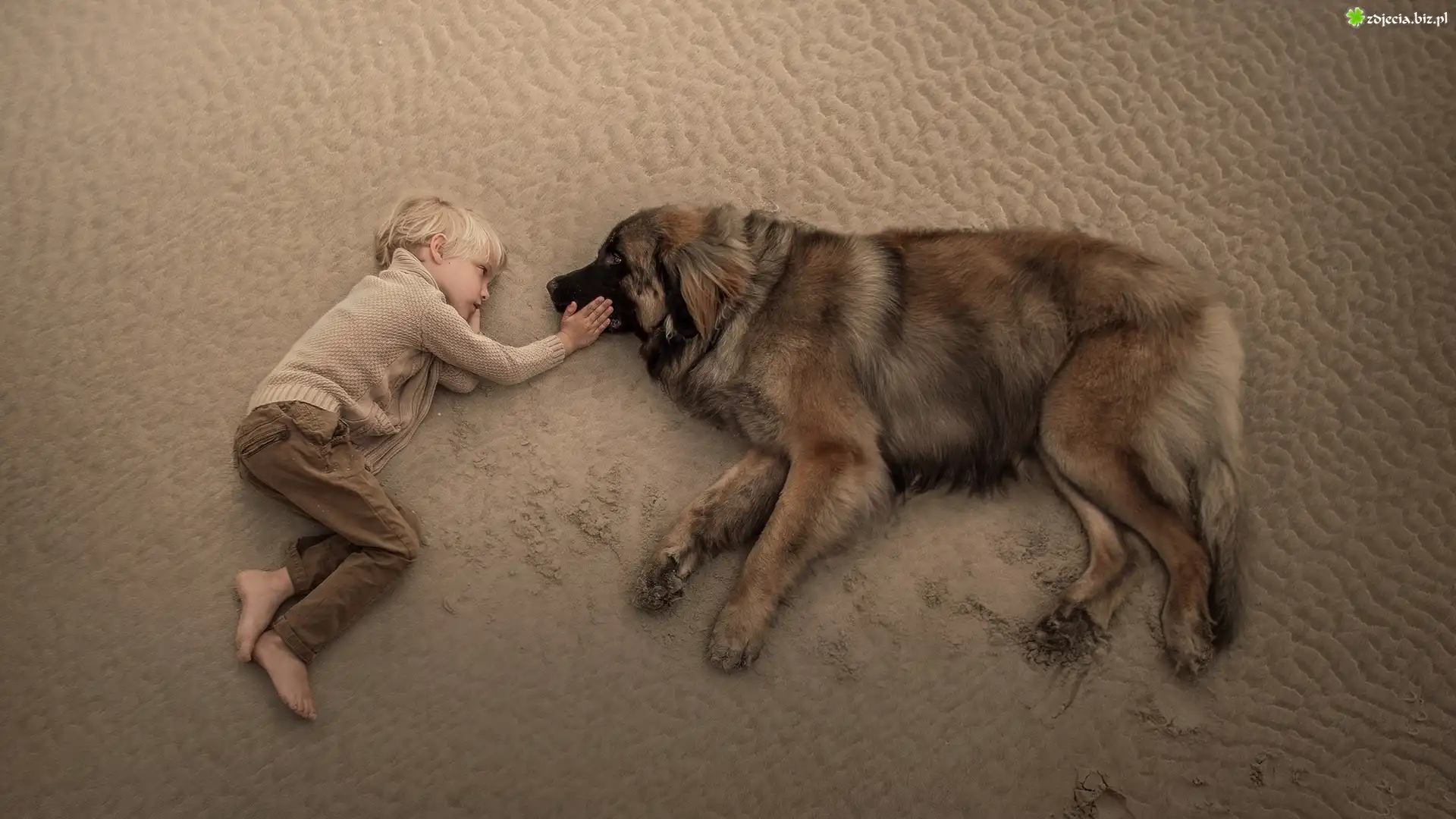 Zdjęcie Chłopiec, Pies, Leonberger, Plaża