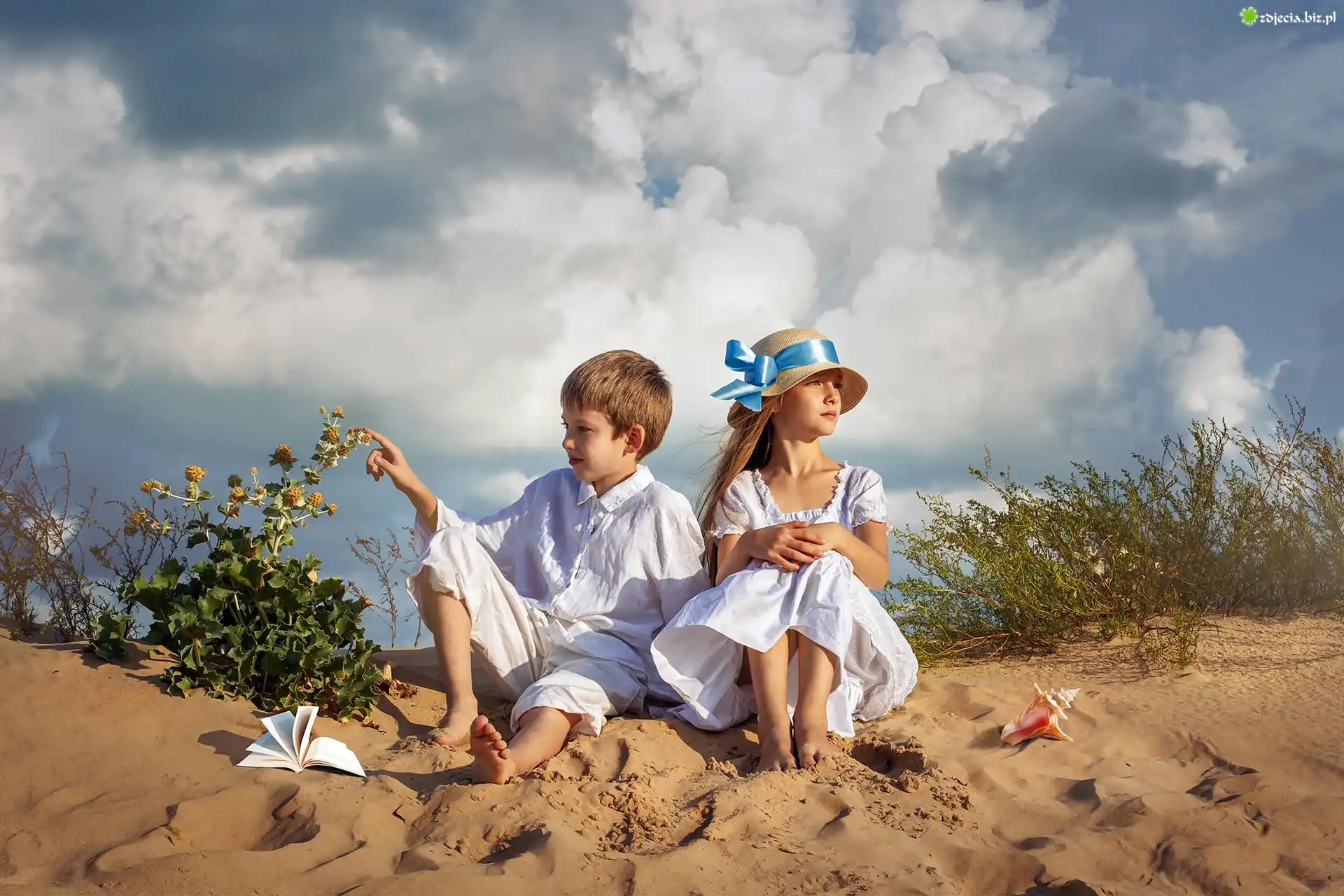 Zdjęcie Dzieci, Chłopiec, Dziewczynka, Plaża, Piasek, Książka, Muszla, Rośliny