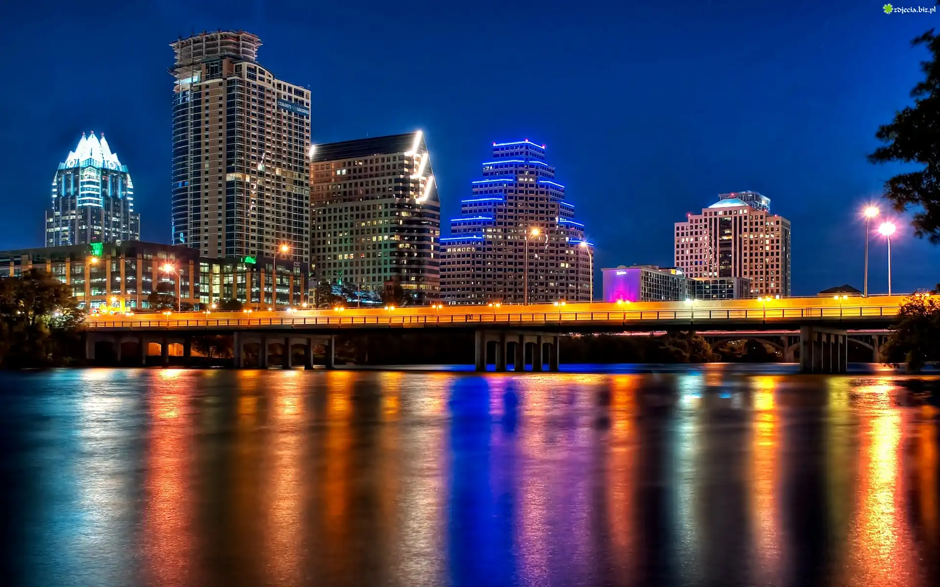 Zdjęcie Drapacze, Chmur, Rzeka, Kolorado, Most, Austin, Miasto, Nocą