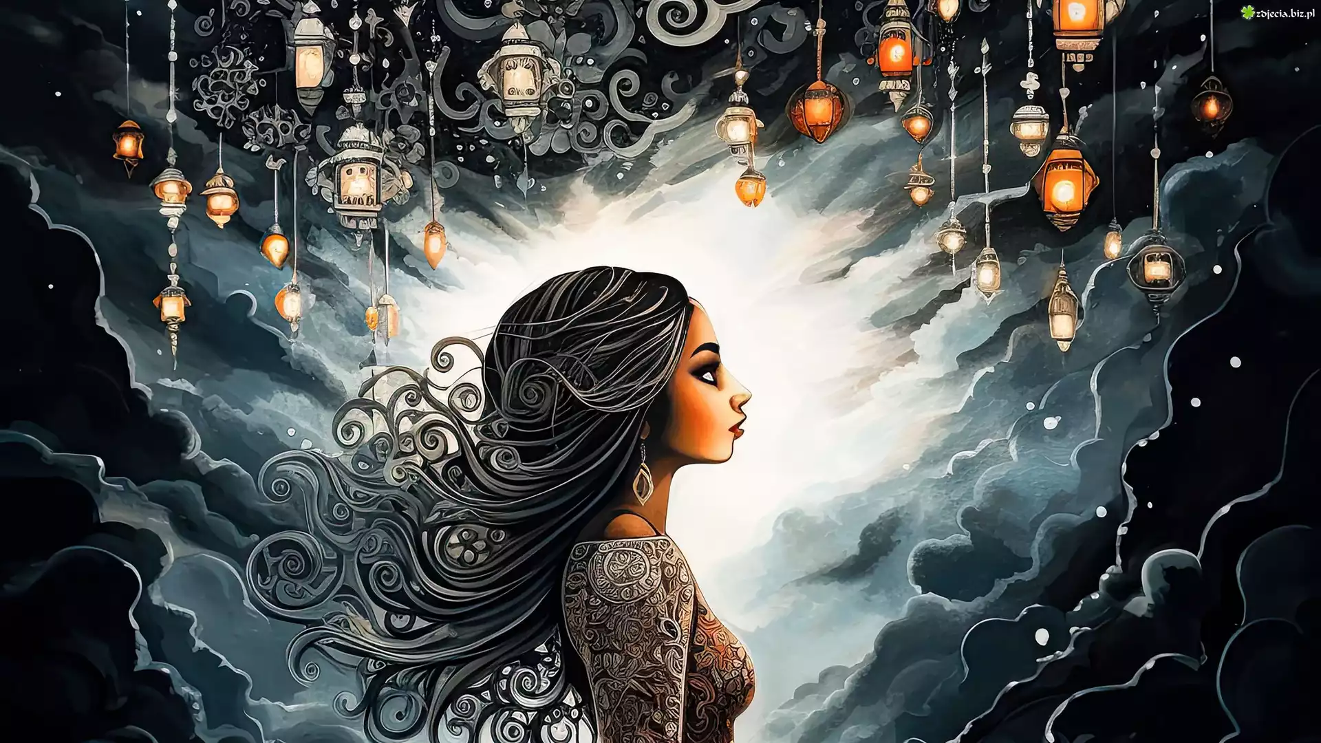 Zdjęcie Dziewczyna, Biżuteria, Lampy, Chmury, Grafika 2D
