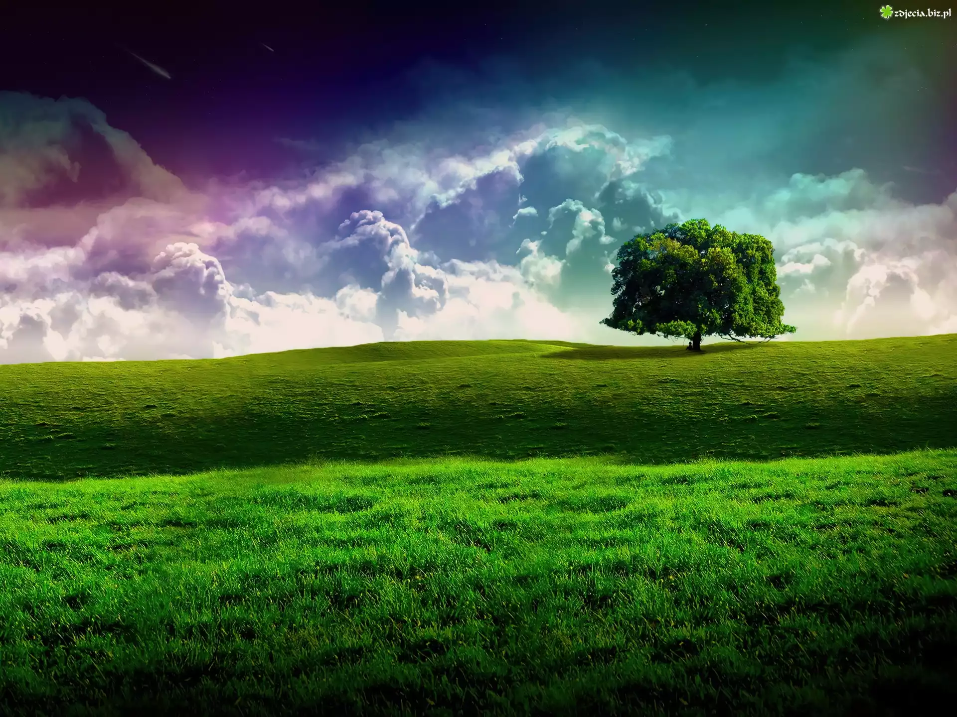 Zdjęcie Chmury, Samotne, Drzewo, Łąka, Trawa