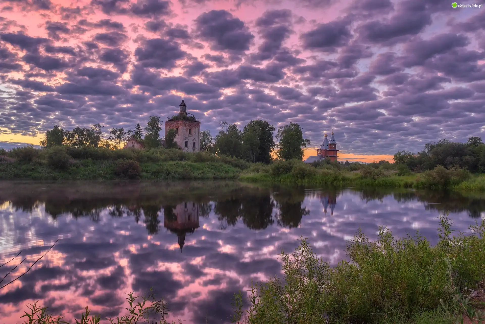 Zdjęcie Chmury, Niebo, Rzeka, Cerkiew, Rośliny, Drzewa, Ruina, Odbicie, Wieś Zaruchevskaya, Rejon wielski, Obwód archangielski, Rosja |