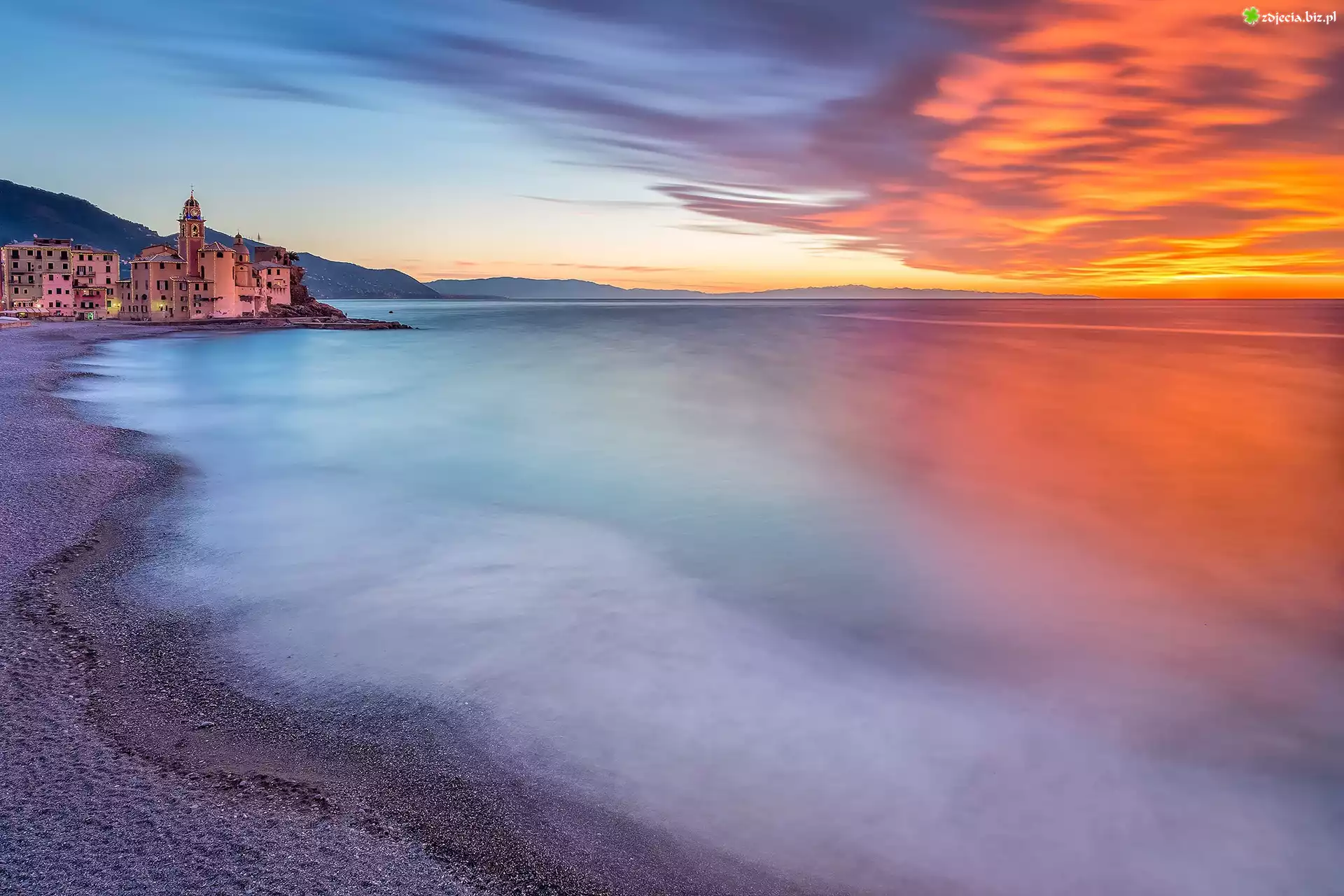 Zdjęcie, Włochy, Liguria, Camogli, Kościół, Budynki, Zachód słońca, Morze, Chmury