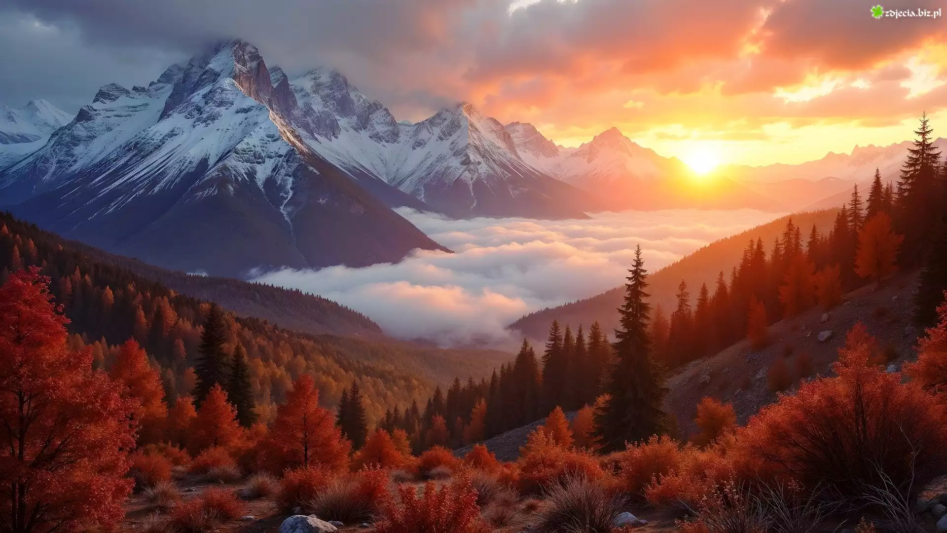 Zdjęcie Jesień, Góry, Dolina, Mgła, Drzewa, Las, Niebo, Chmury