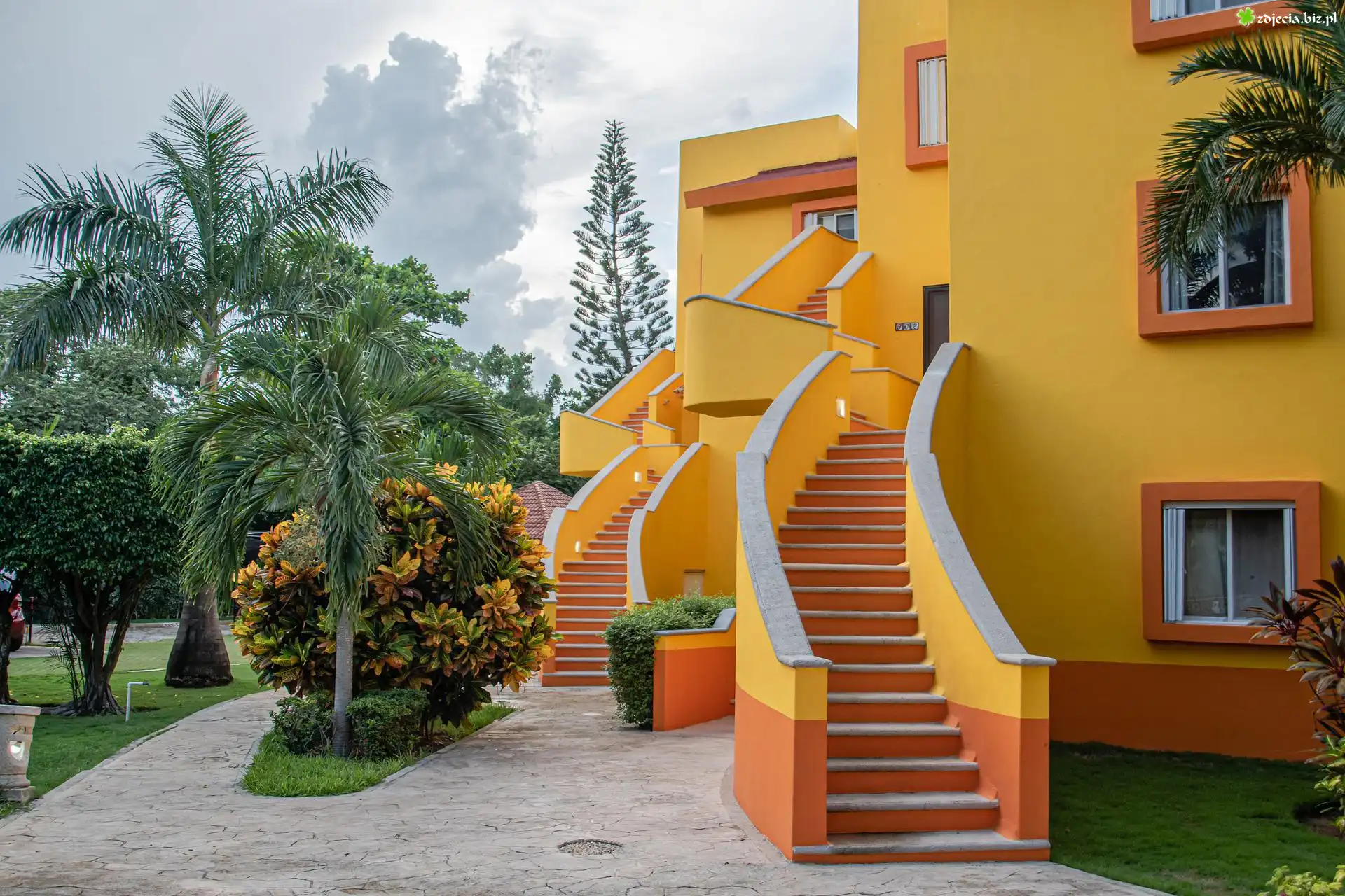 Zdjęcie Dom, Schody, Palmy, Chmury