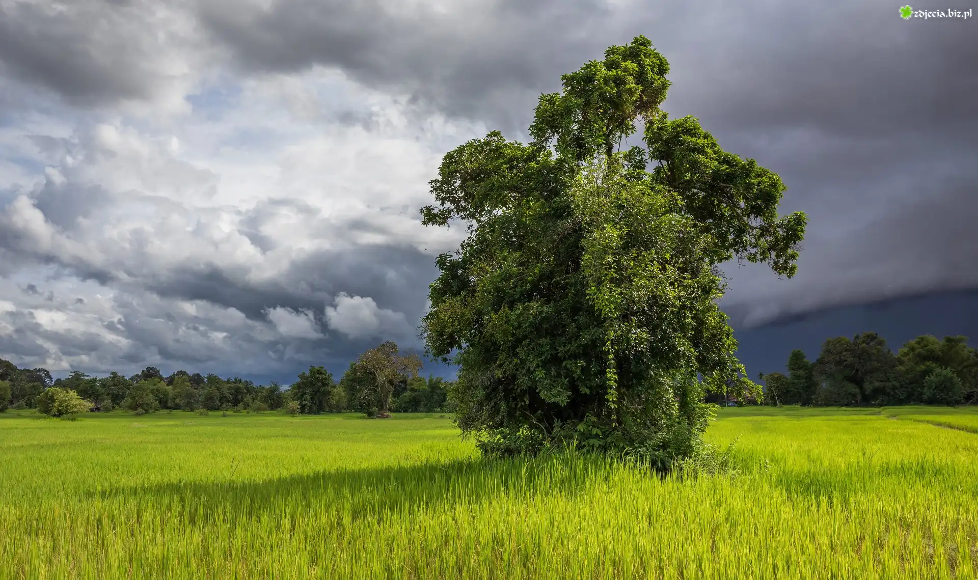 Zdjęcie Chmury, Pole, Drzewa, Trawa