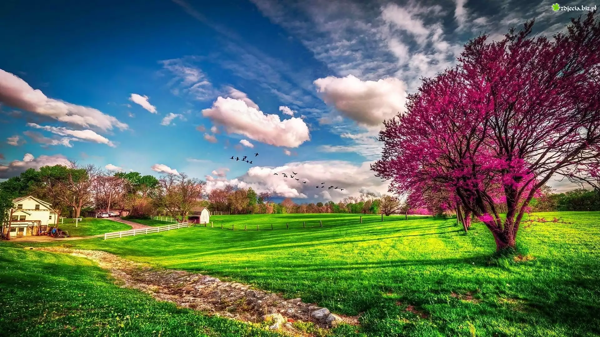 Zdjęcie Łąki, Drzewo, Chmury, Ptaki