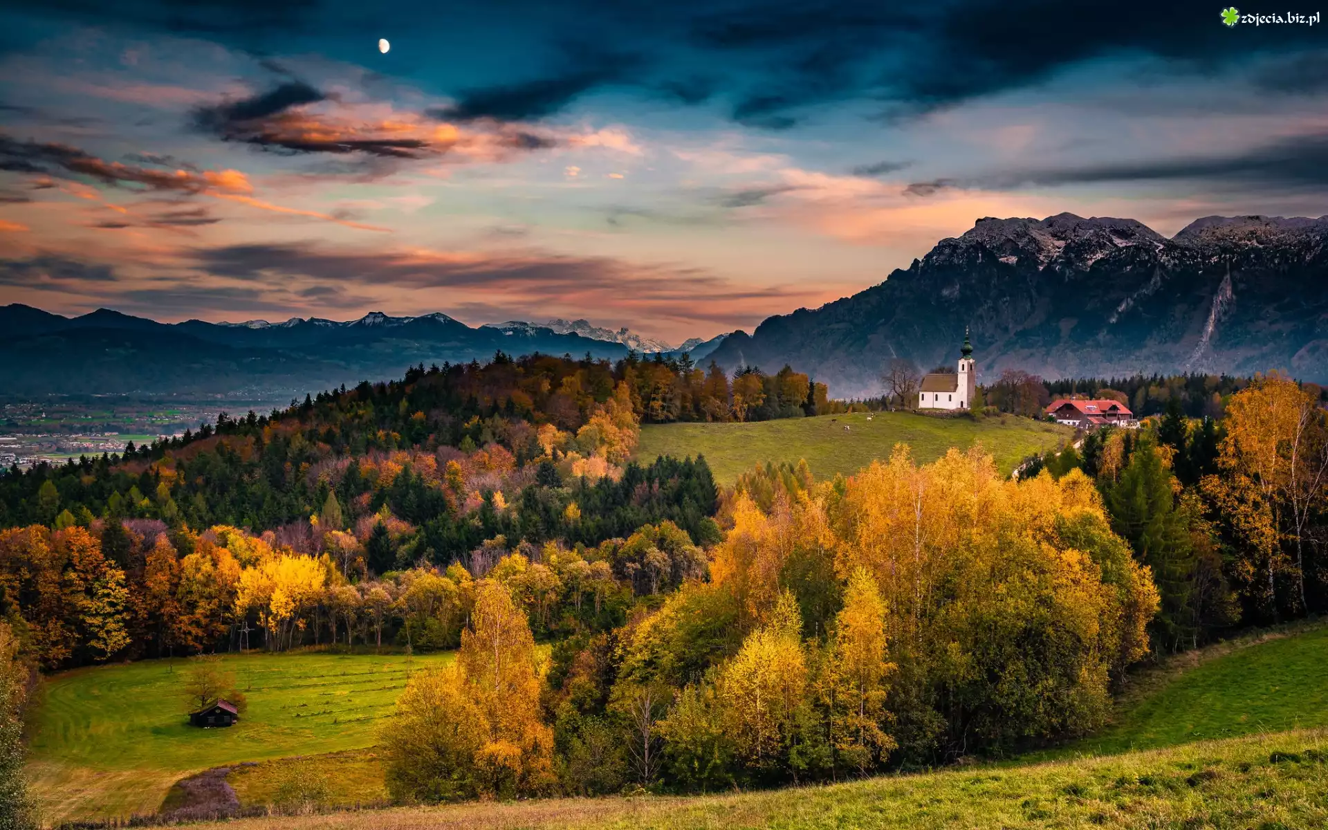 Zdjęcie Niemcy, Bawaria, Alpy, Berchtesgaden, Jesień, Las, Góry, Drzewa, Polana, Dom, Wzgórze, Kościół, Niebo, Chmury, Księżyc, Wieczór |