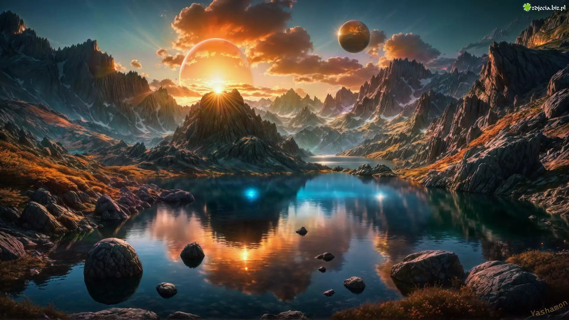 Zdjęcie Góry, Skały, Jezioro, Chmury, Odbicie, Grafika