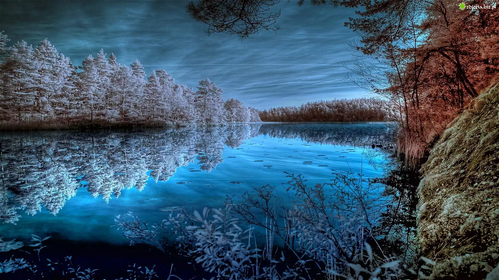 Zdjęcie Chmury, Drzewa, Jezioro, Odbicie