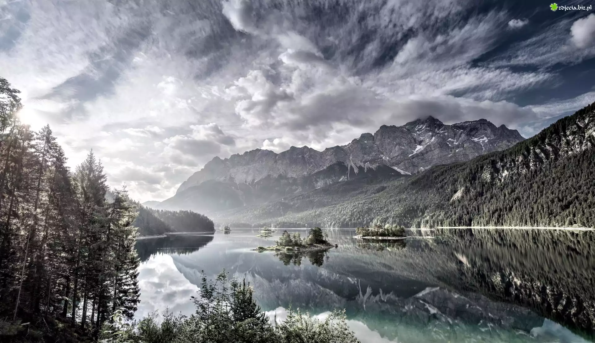 Zdjęcie Chmury, Góry, Lasy, Jezioro, Wyspy