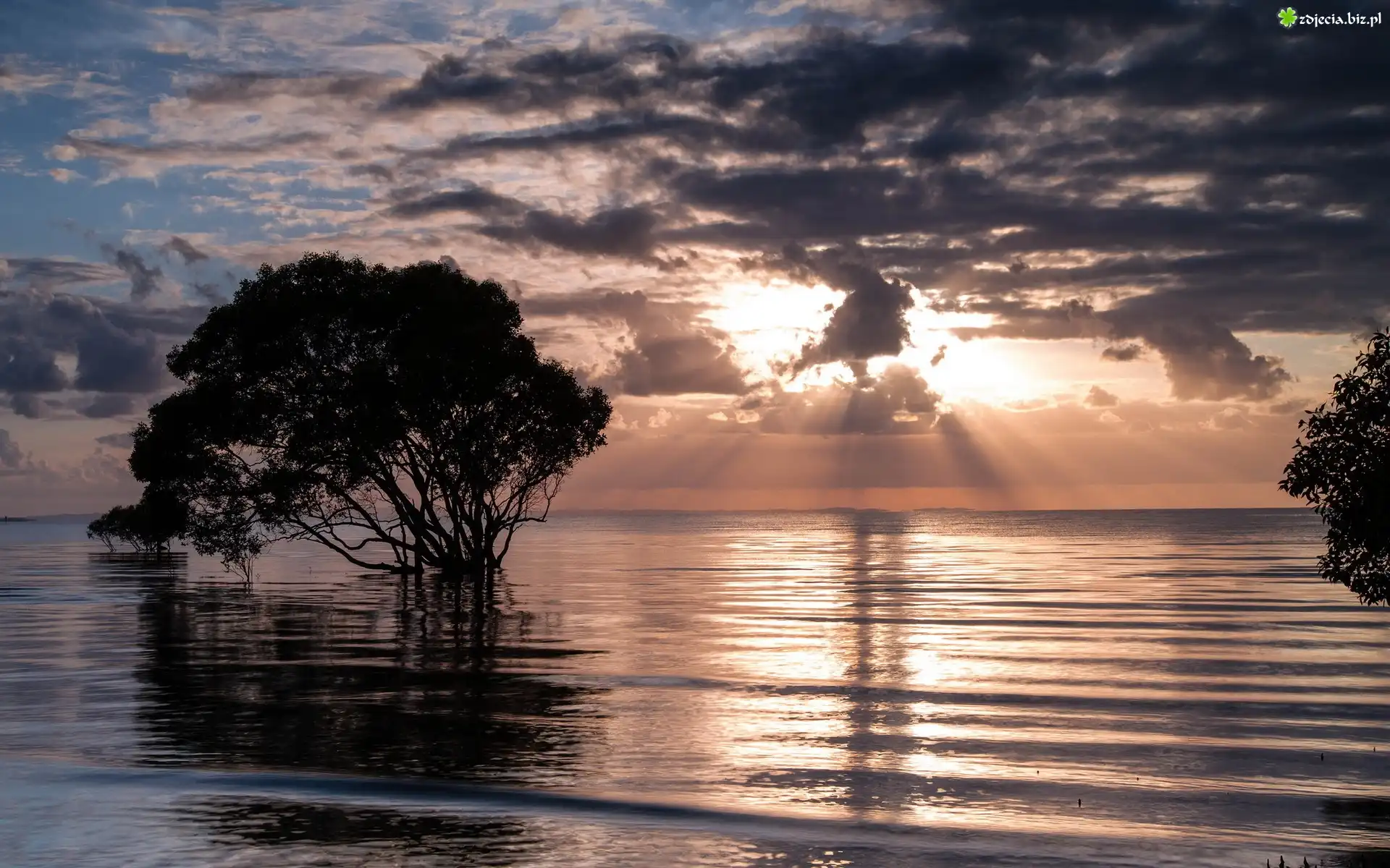 Zdjęcie Chmury, Promienie Słońca, Jezioro, Drzewa