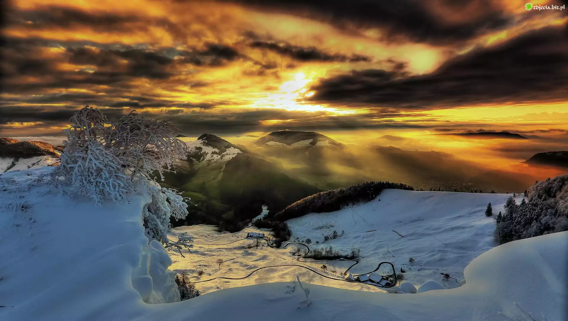 Zdjęcie Szwajcaria, Góry Jura, Lasy, Zima, Zachód słońca, Drzewa, Chmury