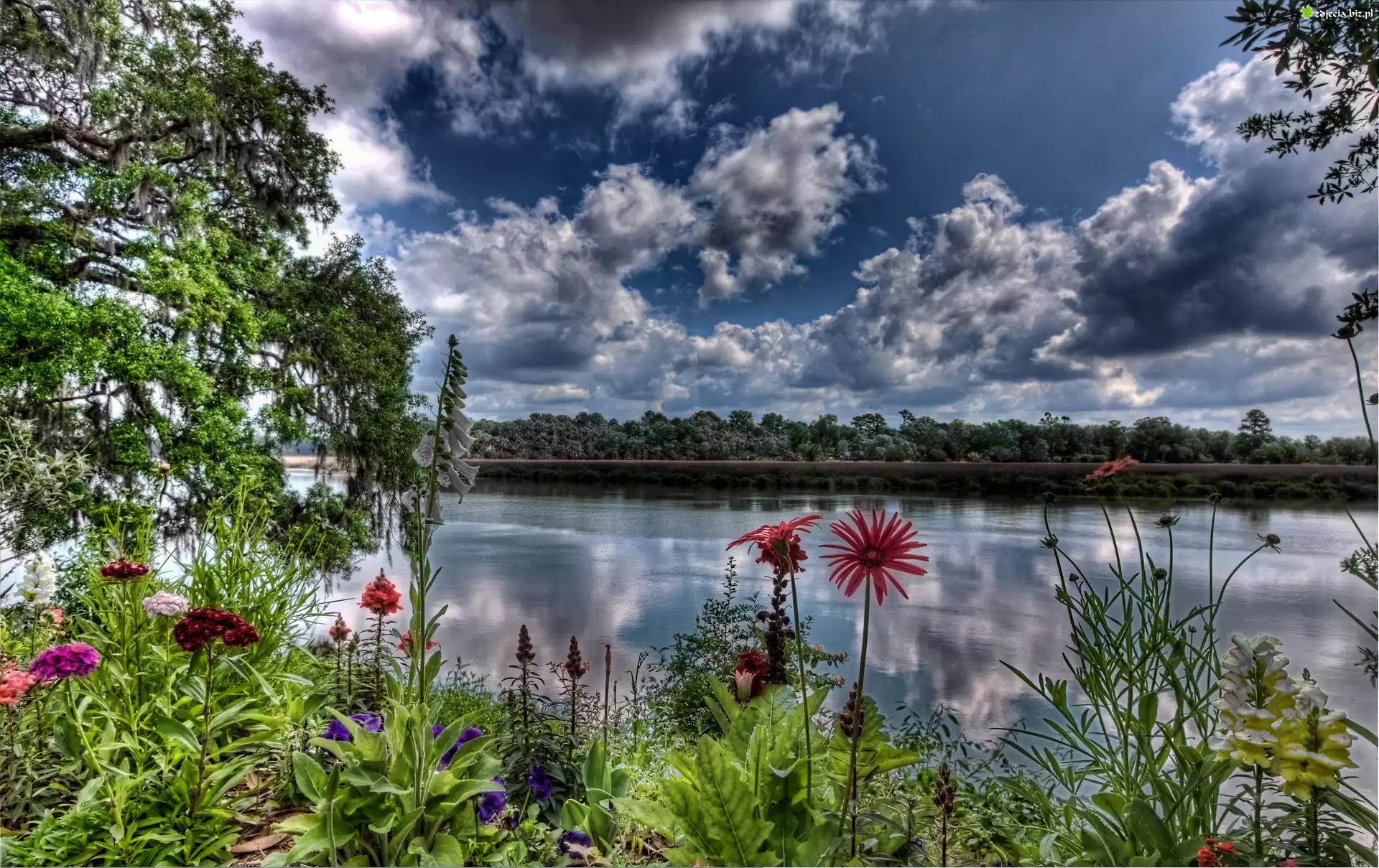 Zdjęcie, Chmury, Jezioro, Kwiaty, Drzewa