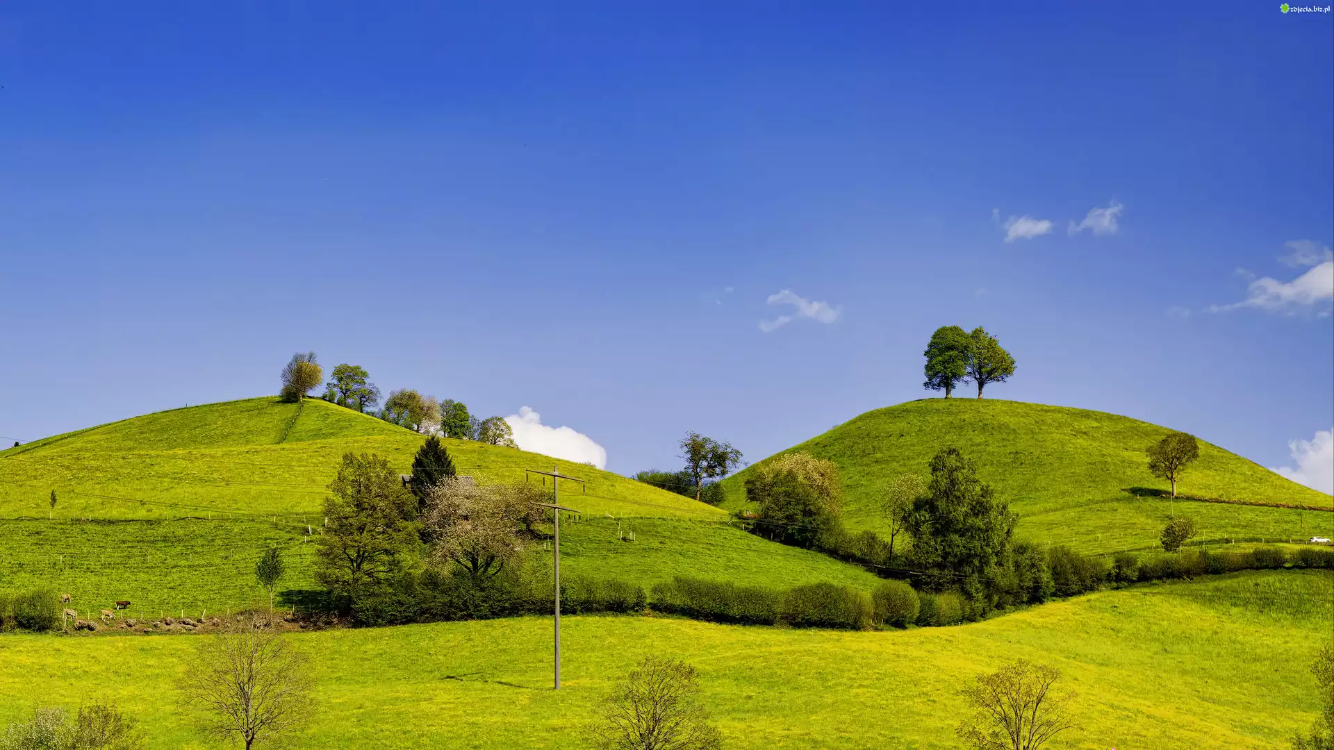 Zdjęcie Wzgórza, Pole, Drzewa, Chmury, Krajobraz, Łąka
