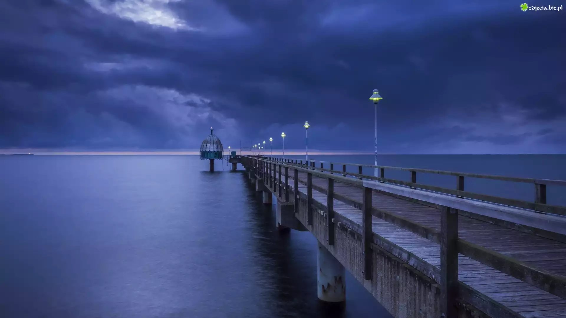 Zdjęcie Molo, Morze Bałtyk, Ciemne, Chmury, Latarnie, Atrakcja, Dzwon nurkowy, Zinnowitz, Meklemburgia-Pomorze Przednie, Niemcy |