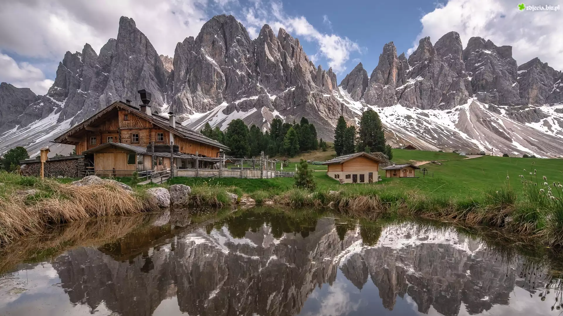 Zdjęcie, Włochy, Dolomity, Góry, Masyw Odle, Drewniane, Domy, Staw, Drzewa, Chmury