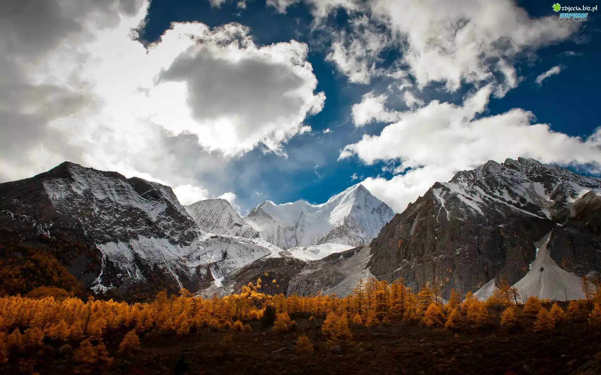 Zdjęcie, Chmury, Góry, Żółte, Świerki