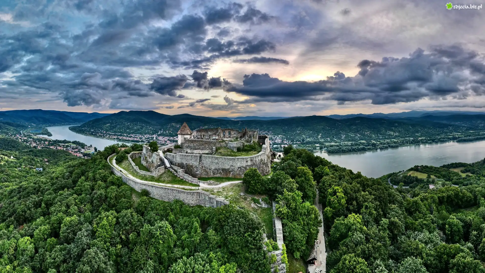 Zdjęcie Węgry, Wyszehrad, Rzeka, Dunaj, Wzgórza, Drzewa, Ruiny, Cytadela, Chmury