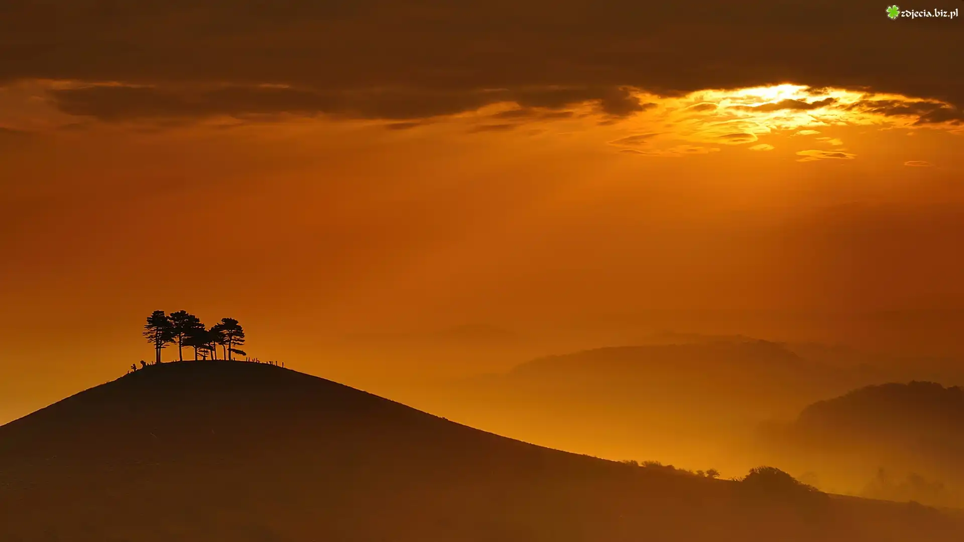 Zdjęcie Chmury, Góry, Zachód, Słońca, Drzewa