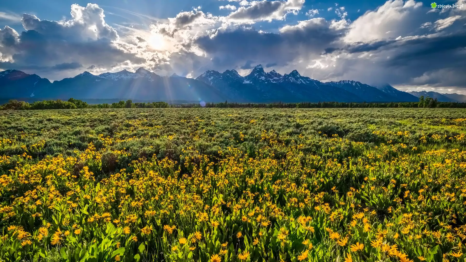 Zdjęcie Kwiaty, Łąka, Góry, Chmury, Promienie słońca, Park Narodowy Grand Teton, Wyoming, Stany Zjednoczone |