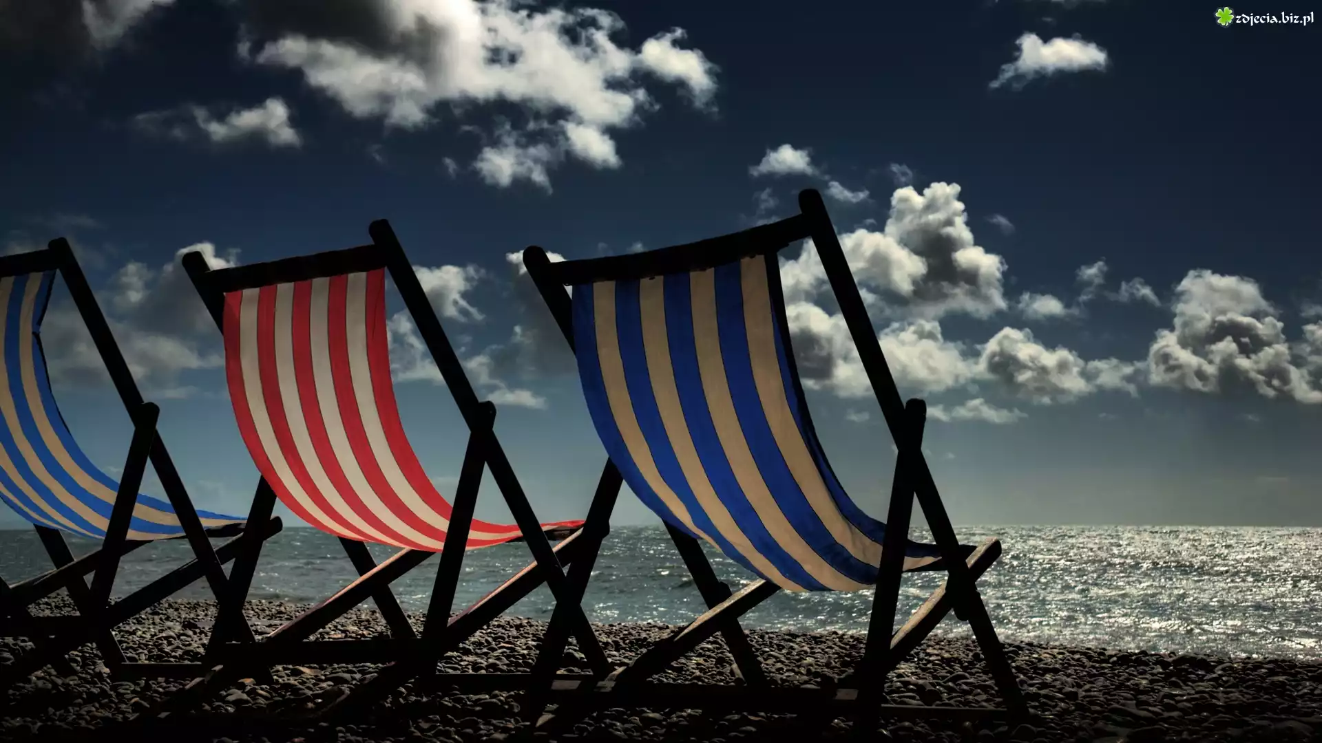 Zdjęcie Chmury, Morze, Plaża, Trzy, Leżaki, Wakacje
