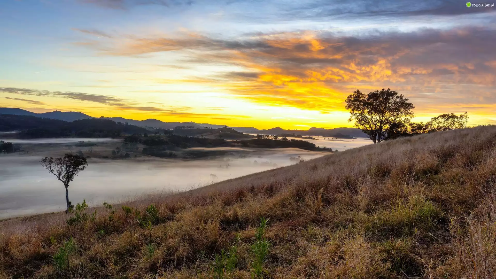 Zdjęcie Mgła, Zachód słońca, Chmury, Drzewa, Wzgórze