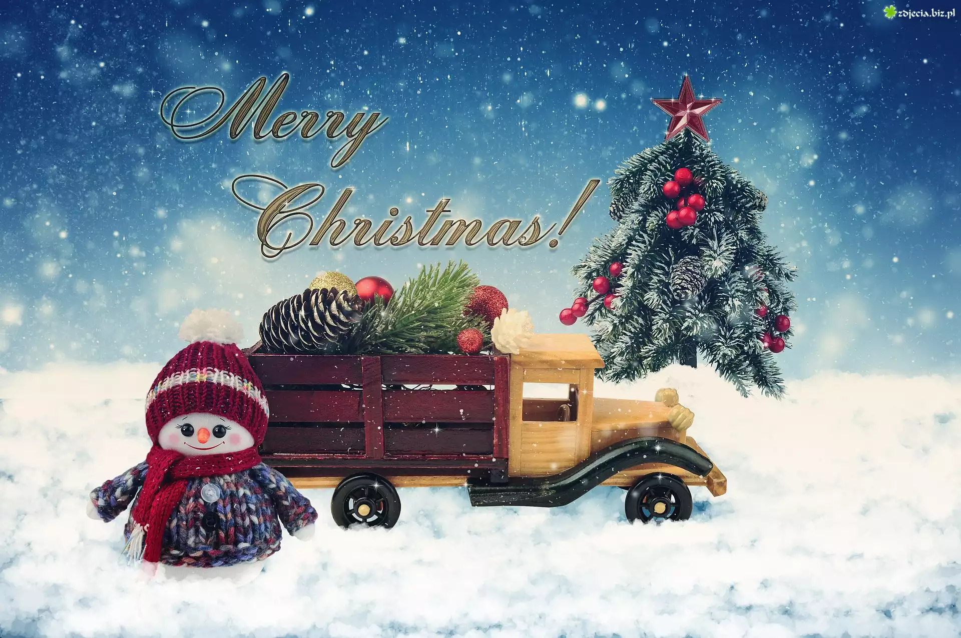 Zdjęcie, Boże Narodzenie, Bałwanek, Choinka, Ciężarówka, 2D