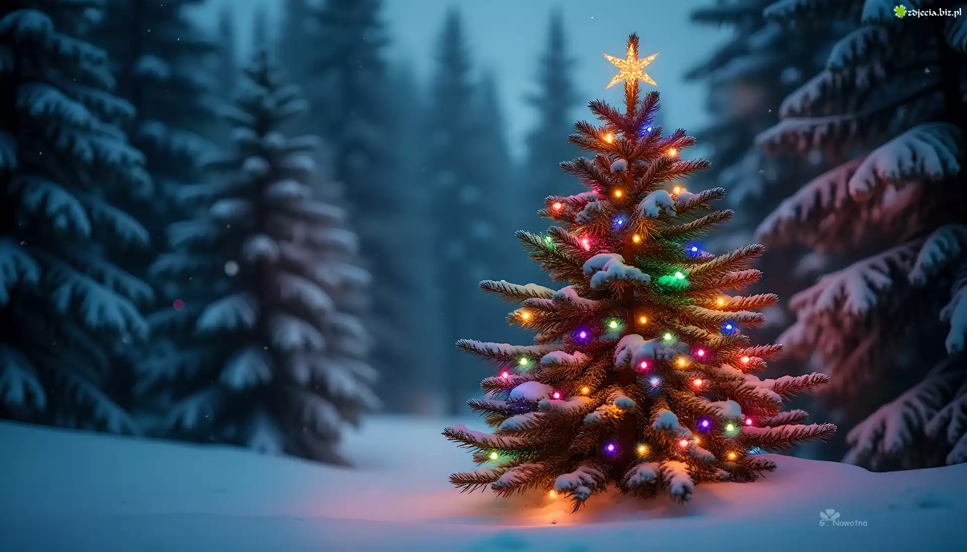 Zdjęcie Boże Narodzenie, Oświetlona, Choinka, Las, Zima, Grafika