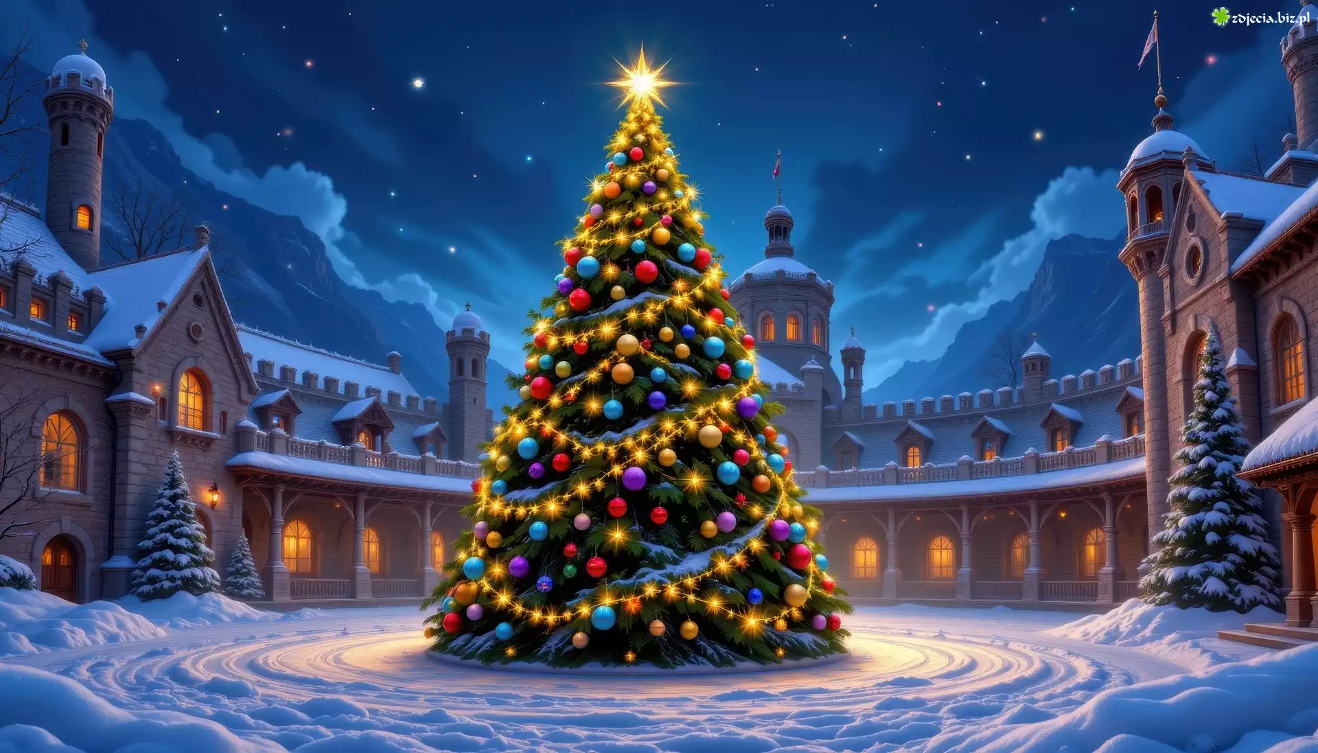 Zdjęcie Boże Narodzenie, Udekorowana, Choinka, Zima, Domy, Wieża